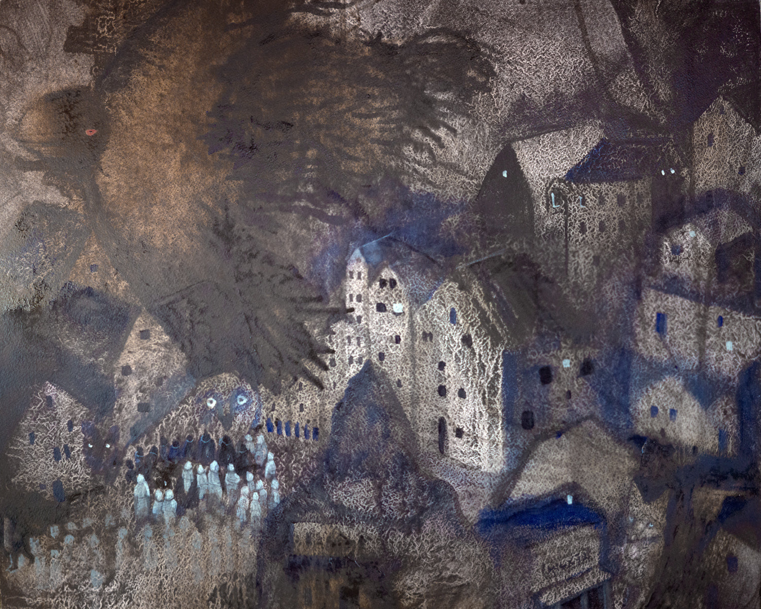 The people of the town did everything they could to get rid of the Rag Bird, including performing night banishing rituals. This huge creature--or spirit--had appeared one night and haunted the town with the its rumbling bass cries that shook the buildings. The peoples spirit helpers--cat, owl, and fox--did their best to protect the townspeople and their pets, but the Rag Bird wouldn't leave. So they called in the Sorcerer, who here stands in the center of town, watching and listening to the Rag Bird, learning how to banish it--or at least to determine why it appeared and what it wants.